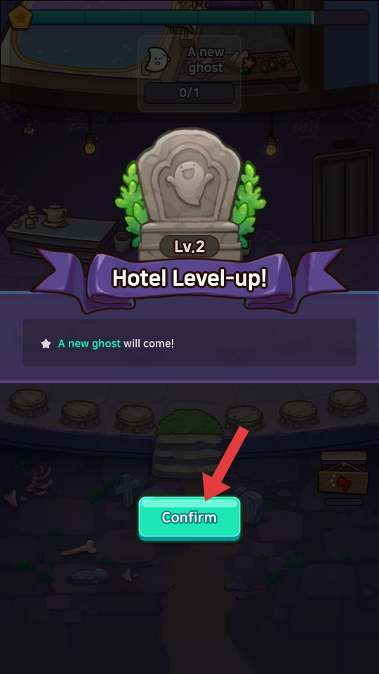 4、当满足升级条件会触发Hotel Level up提示,点击Confirm确认升级,升级后酒店等级提升,能解锁新内容丰富客源,还可解锁更高级设施,提升接待能力与收益上限。