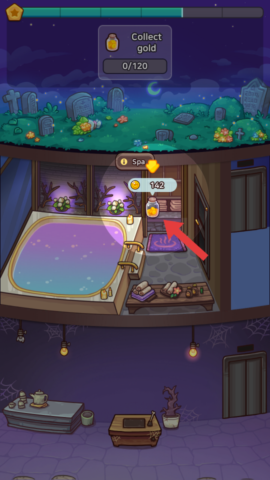 3、在闲置幽灵酒店里金币是发展的基础,进入Spa等功能区域,看到标有金币数量的瓶子,点击它就能收集金币,积累到一定数量可用于酒店升级、解锁新设施。