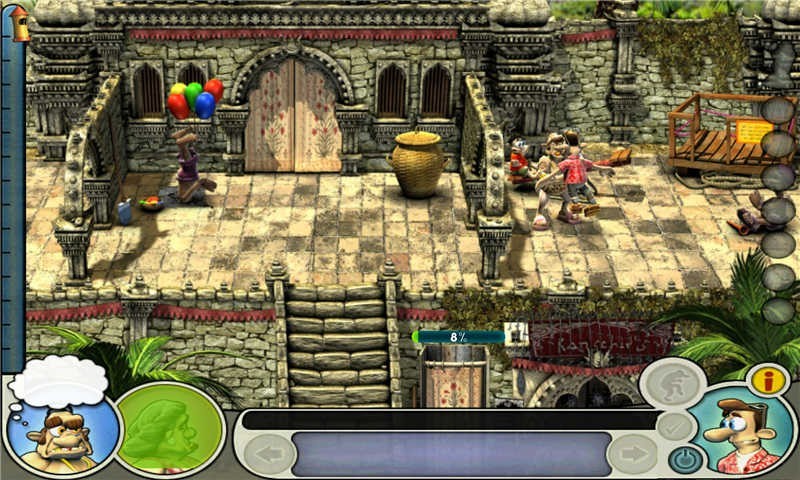 首先等老头离开左上,把石灰粉倒在水槽里,把花给牛吃,就放在右边槽里就好;到右中,先在老头的食物和饮料里放辣椒和烈酒,再给食肉花吃鸡腿,然后给它装上食人鱼的牙齿(;这时如果老母在右下的话就躲在石像里,等她上到右上去的话就马上到右下,把装满蚂蚁的玻璃瓶放在船里;到左下(这时因为先前的马蜂窝掉了下来,可以先去捡,在左上),在玩具马上装上蜂窝,用石像之手把木马的开关弄松;到左上看好戏。