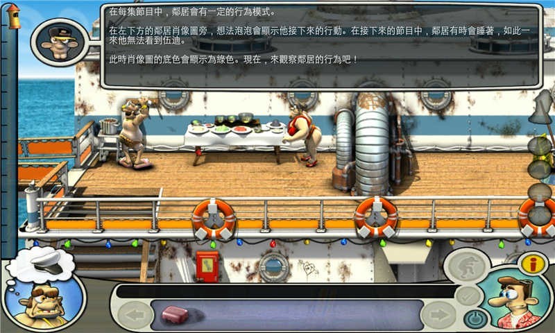 首先等老头离开左下,到左下,拿毯子,直接到右下把毯子铺在舱口上,回左下,还有信号弹要捡;然后等老头离开左上,到左上,等老头离开右中,到右中,捡玻璃碎片,地毯下有密码纸,包里有安眠药,等老头离开右下;到右下,用玻璃碎片把货物架的掉绳割开;到左上等待,等老头离开右中,马上走到右中的楼梯口等待,把握时机,等老头快要中圈套时向下走,走到时老头应该已经离开右下,立即捡起鱼往右上跑;然后上楼梯的时候就选中鱼,然后对左上的花盆使用,使用完后马上往回走,选中右的椅子躲藏(这个一定要快,否则会被老头他妈打);等老头离开右中,老母睡着,马上冲到左下,在水桶上放鱼,拿毛巾,迅速返回右中,再到左上,对脏的玻璃墙用毛巾,然后捡鹦鹉身上的钥匙;回右中,把信号弹装上,到躺椅躲藏;老头被整离开右中,在船长室使用安眠药和密码纸,回到躺椅,恭喜,你通关了。