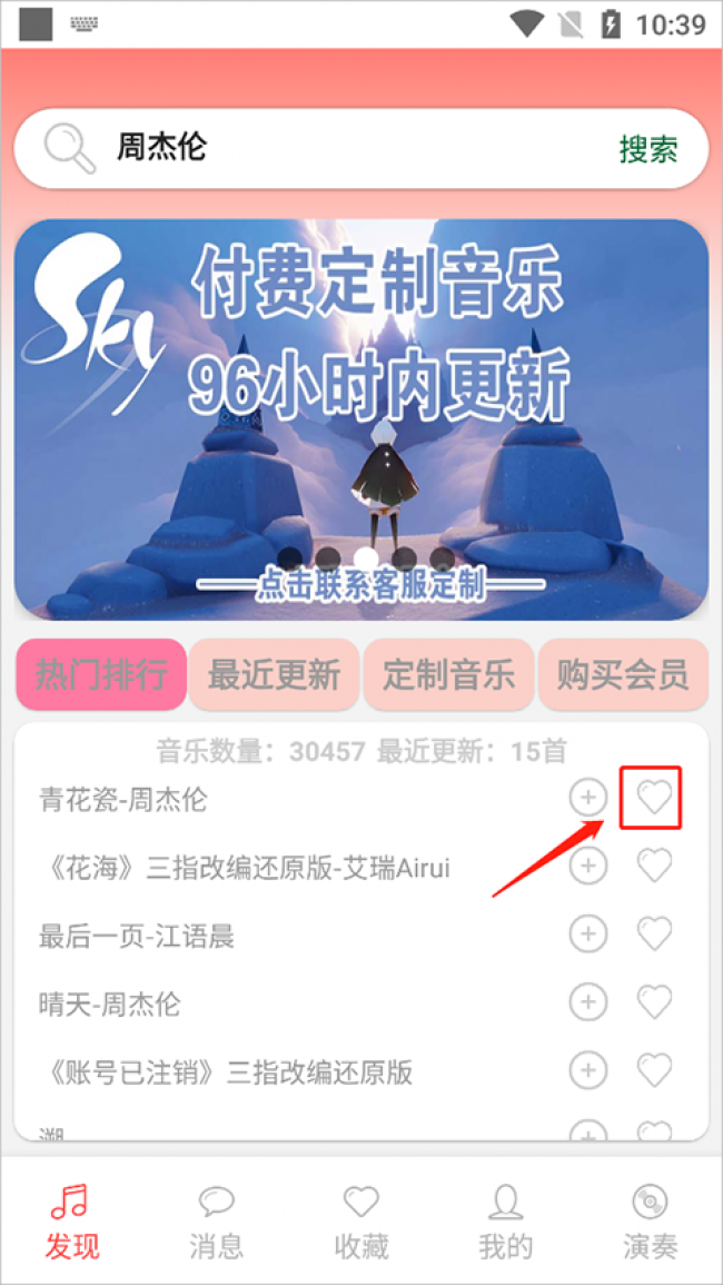3、点击右侧的爱心就可以收藏你喜欢的歌曲了;
