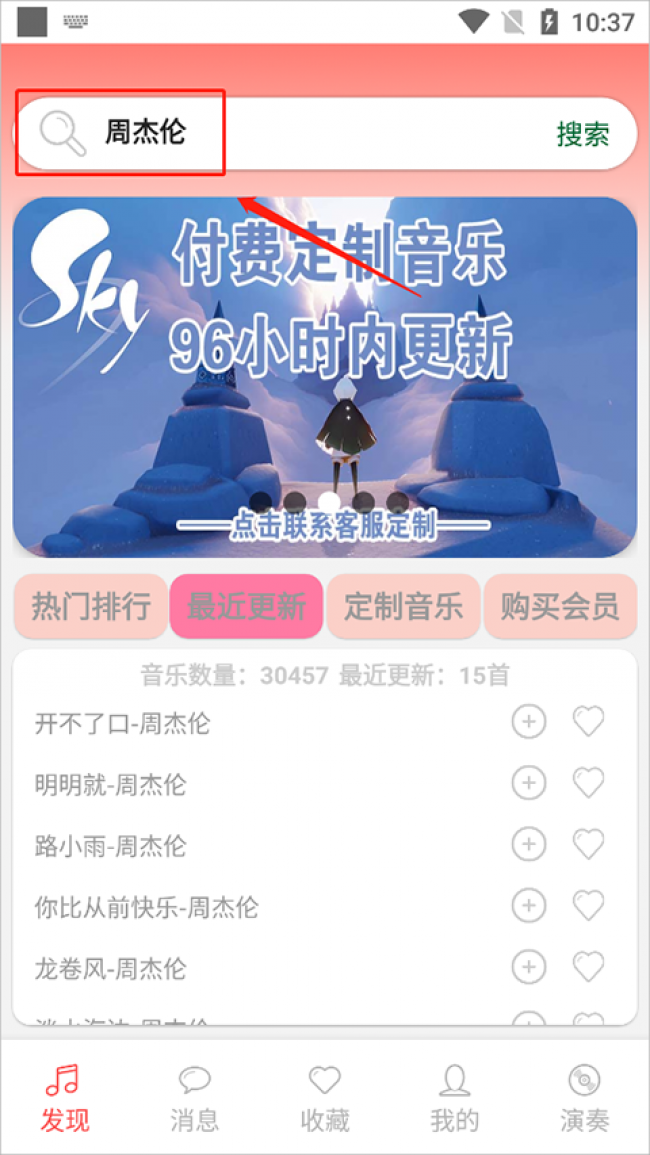 2、可以直接进行搜索你想听的音乐歌曲,比如:周杰伦;