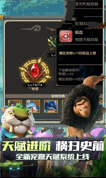 2、操作玩法都十分的轻松简单,升级进阶角色的天赋提升战力横扫史前畅快冒险。