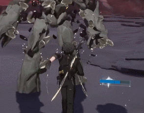 消耗一定体力,后撤并向前扔出回旋剑造成光鸣伤害。适当的时间内再次施展普攻会释放「强制抽取」攻击敌人,命中后自动释放「回声」造成范围光鸣伤害,若该次。「回声」命中同个敌人则会额外回复2点「尘微之声」。