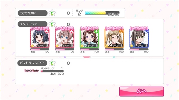 最后是经验值分配,LIVE结束后能分别得到Rank、角色以及乐队的经验值,经验值的多寡取决于玩家所获得的分数评级。其中Rank上升后LIVE Boost会+3(即使满3个时亦会突破上限),亦能解开主线故事,乐队等级上升后能解开乐队故事。