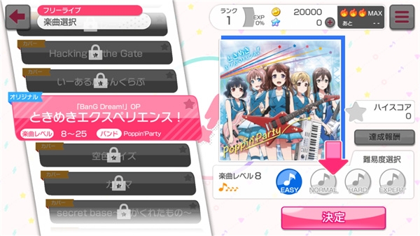 随即来到LIVE部分,新手教学时只能打本家曲「ときめきエクスペリエンス」的其中一节,但是难度可以自选,Easy最简单,Expert最难。顺带一提,GBP的LIVE是非体力制的,只要想打就能随时开打,唯一会消耗的就只有画面右上方的火焰(LIVE BOOST,每三十分钟回覆一个,每一次LIVE皆会自动消耗一个,发动后在LIVE中获得的金币、经验值、报酬为平常五倍)。