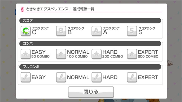 接下来就是成就画面,成就分为「分数」、「指定Combo以上」和「Full Combo」三种,当中后两种会对应不同难度。完成后会获得不同奖励,包括金币、给角色升级用的训练劵还有石头。