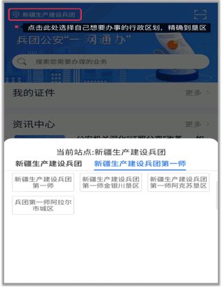 1、注册登录app后进入首页点击左上角位置,可选择自己想要办事的行政区划,精确到垦区;