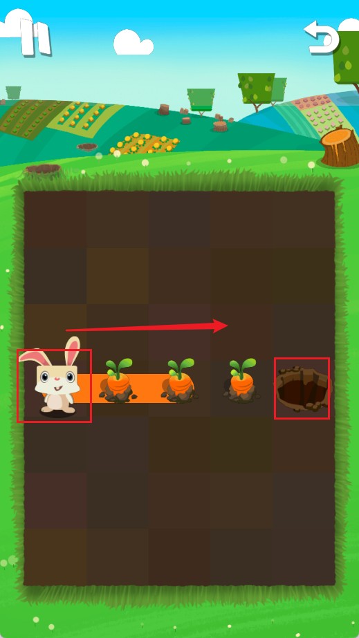 2、点击兔子,画出一条路线让其吃完萝卜进入洞内,完成通关。