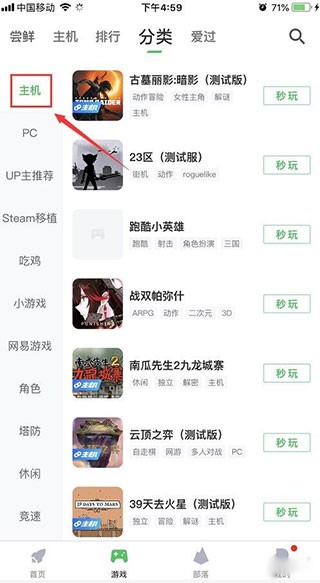 2、点击顶部分类标签,进入游戏分类专区浏览;