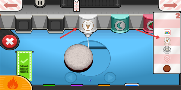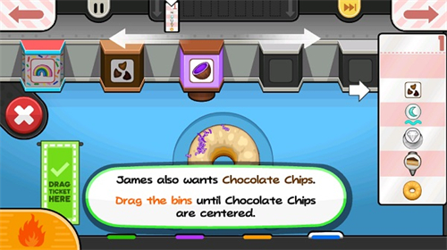 2、制作甜甜圈,根据订单要求,在制作区域选择对应的原料,如冰淇淋等,为甜甜圈进行装饰和添加配料。