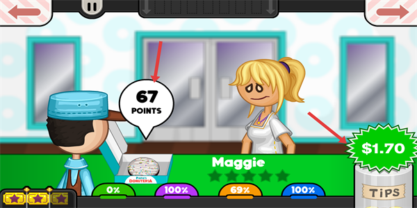3、完成制作后,将制作好的甜甜圈交付给顾客,此时会获得相应的分数和小费。