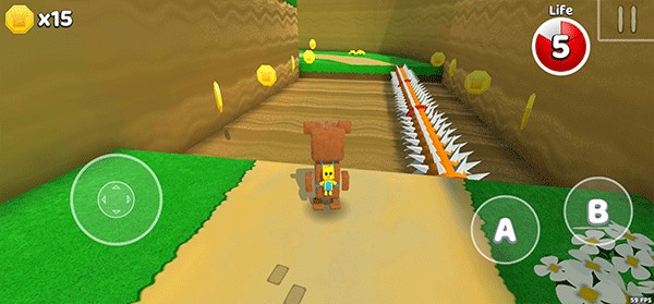 2、左下角轮盘按钮控制超级熊自由移动,右侧屏幕滑动旋转视角,正常情况下A跳跃,B攻击。
