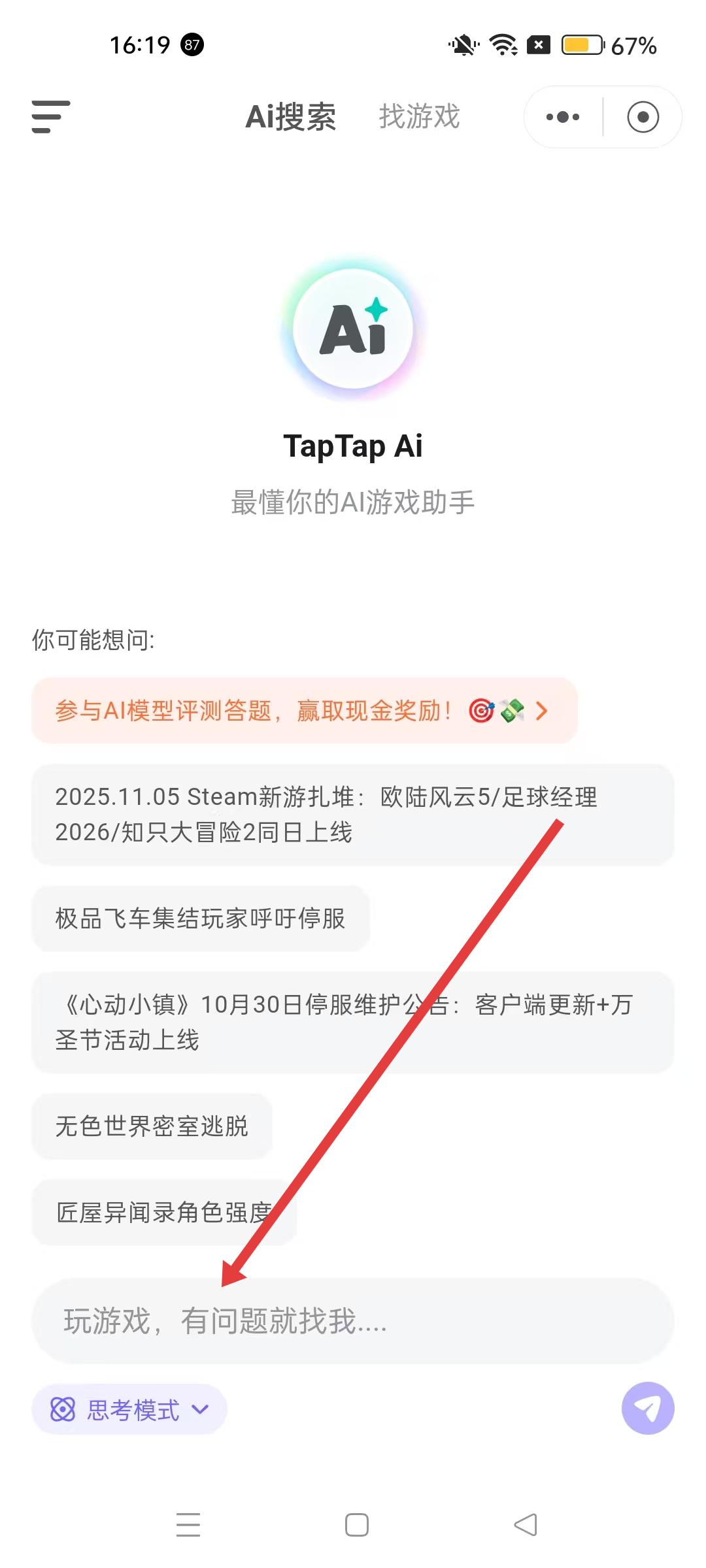 2、点击AI搜索,进入TapTap AI界面,可查看游戏相关资讯,如Steam新游上线、游戏停服维护公告等,获取游戏信息。