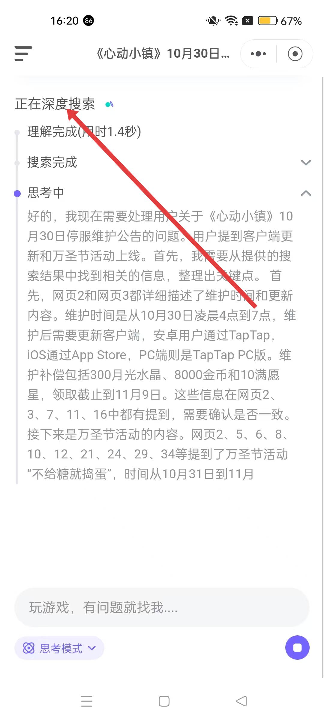 3、AI搜索中选择心动小镇停服维护公告,可查看深度搜索结果,了解维护时间、客户端更新及万圣节活动等详细内容。