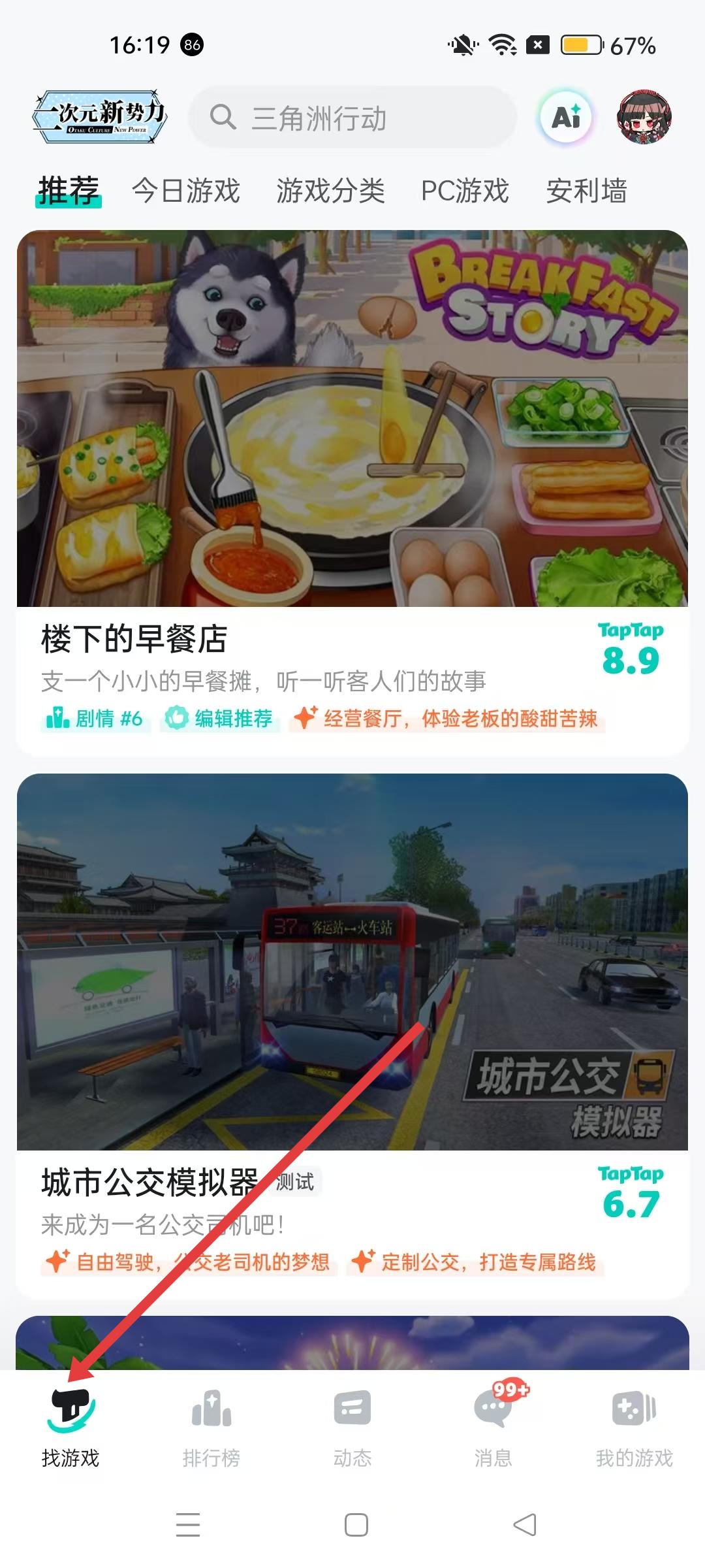1、打开TapTap应用,进入找游戏界面,可浏览楼下的早餐店、城市公交模拟器等推荐游戏,开启游戏探索。