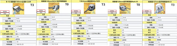 双联B13(左一),通常弹,极佳的轻甲补正,输出距离远,命中好。唯一缺点就是这门炮是北联活动限定,目前只有3门。