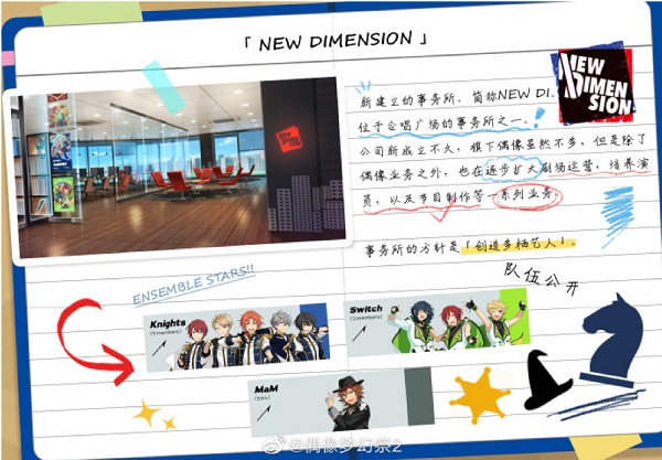 NEW DIMENSION是一家刚成立不久的事务所,简称NEW DI,位于合唱广场。事务所在打造音乐学员业务的同时,也开始发展剧场运营、培养演员、节目制作等业务活动。事务所的方针是“创造多栖艺人”。事务所的队伍有Knights、Switch、MaM。