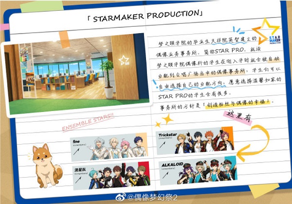 由天祥院英智建立的STARMAKER PRODUCTION事务所,简称STAR PRO,梦之咲学院的音乐学员们刚入学时就会被自动分配在这里,大家可以自由选择的自己的分配方向。事务所的方针是“创造粉丝与音乐学员的幸福”。玩过原作的玩家们熟悉的的fine、Trickstar、流星队以及ALKALOID均在这里。