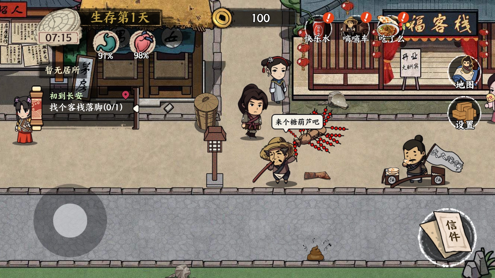 1、首先进入游戏依然是我们比较熟悉的新手教程,大家千万不要怕麻烦选择跳过,完成新手任务我们可以获得少量的金钱,虽然不多,但是可以足够我们前期在唐朝生活一周是没有问题的,前期的赚钱工作和打工模拟器一样,种类比较少,而且大多是你叫浪费时间的体力活,刷马桶的工作我是不太建议大家去做的,会很大程度上降低我们的健康值,健康值过少的话还要花费金钱去看病,得不偿失。