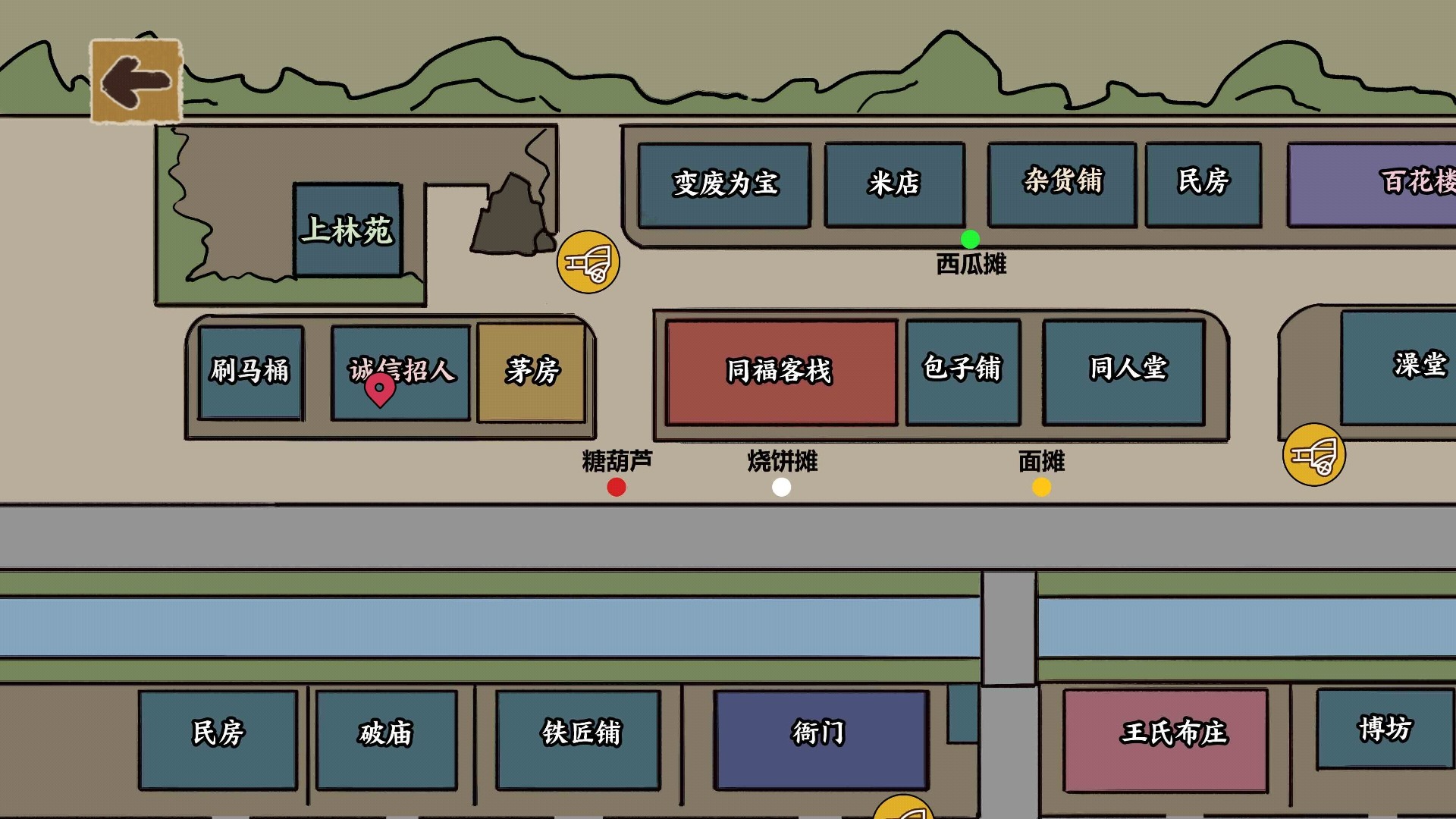 6、进入地图界面,可以看到当前所在的位置,和游戏中各个场景和摊子的地址。