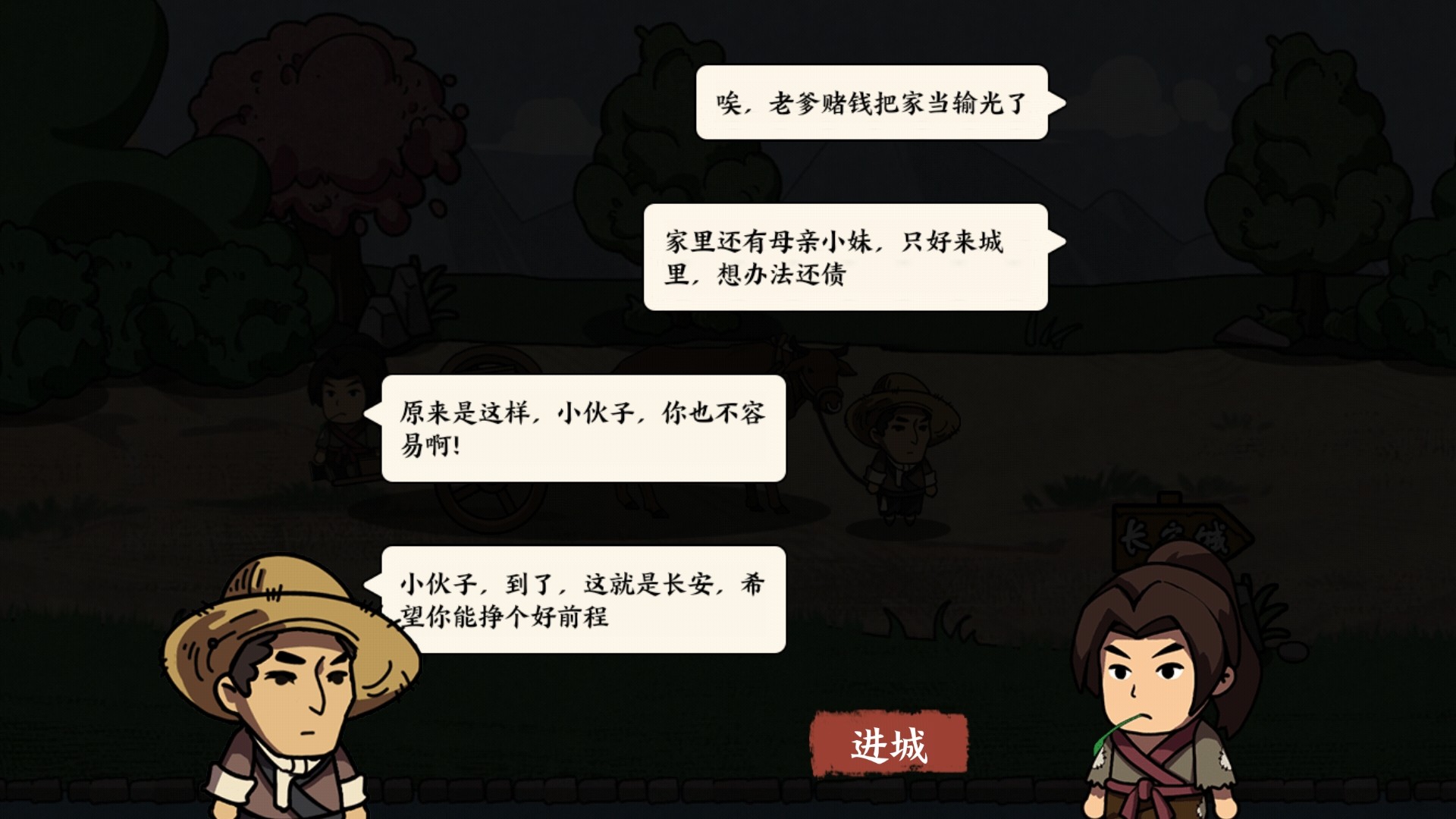 2、进入游戏剧情动画界面,根据剧情的引导选择相应的选项就可以进城了。