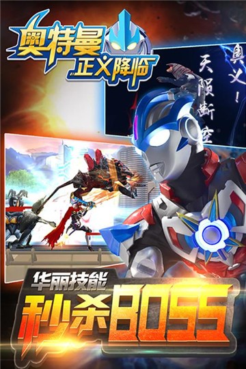 奥特曼正义降临是一款奥特曼题材的动作格斗类游戏,玩家可以扮演各种强大的奥特曼,在横版的冒险闯关关卡里,使用华丽的技能暴打小怪兽。游戏中一共有迪迦奥特曼、迪迦闪耀、艾克斯奥特曼、欧布奥特曼等,每个奥特曼都有独特的技能,以应对不同的作战场景。扮演人气最高的迪迦奥特曼,化身为光,使用哉佩利敖光线、迪迦飞踢、闪耀毁灭、奥特屏障,还能够变换形态。