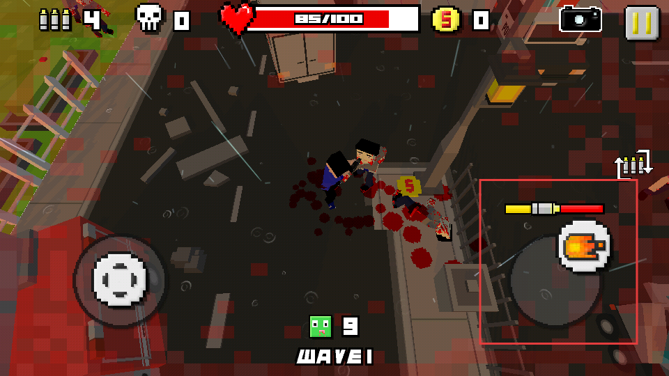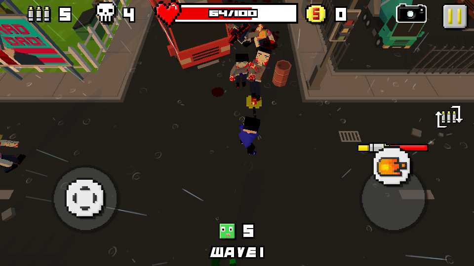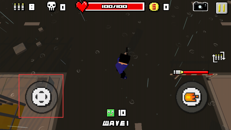 1、用左侧虚拟摇杆操控角色移动,在场景里探索,躲避僵尸,寻找有利战斗位置,为攻击僵尸做准备。