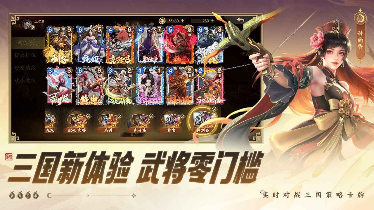 你可以在上百张卡牌中构筑只属于你的套牌,充分利用“武将卡、奇兵卡、锦囊卡”的组合搭配,获得最终的胜利。