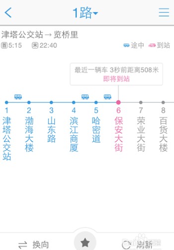 4、下图就是天津公交1路的实时查询结果,显示目前共有3辆公交车,每一辆公交车的实时位置,看到这些情况,是不是可以缓解你等公交车的焦急心情呢?