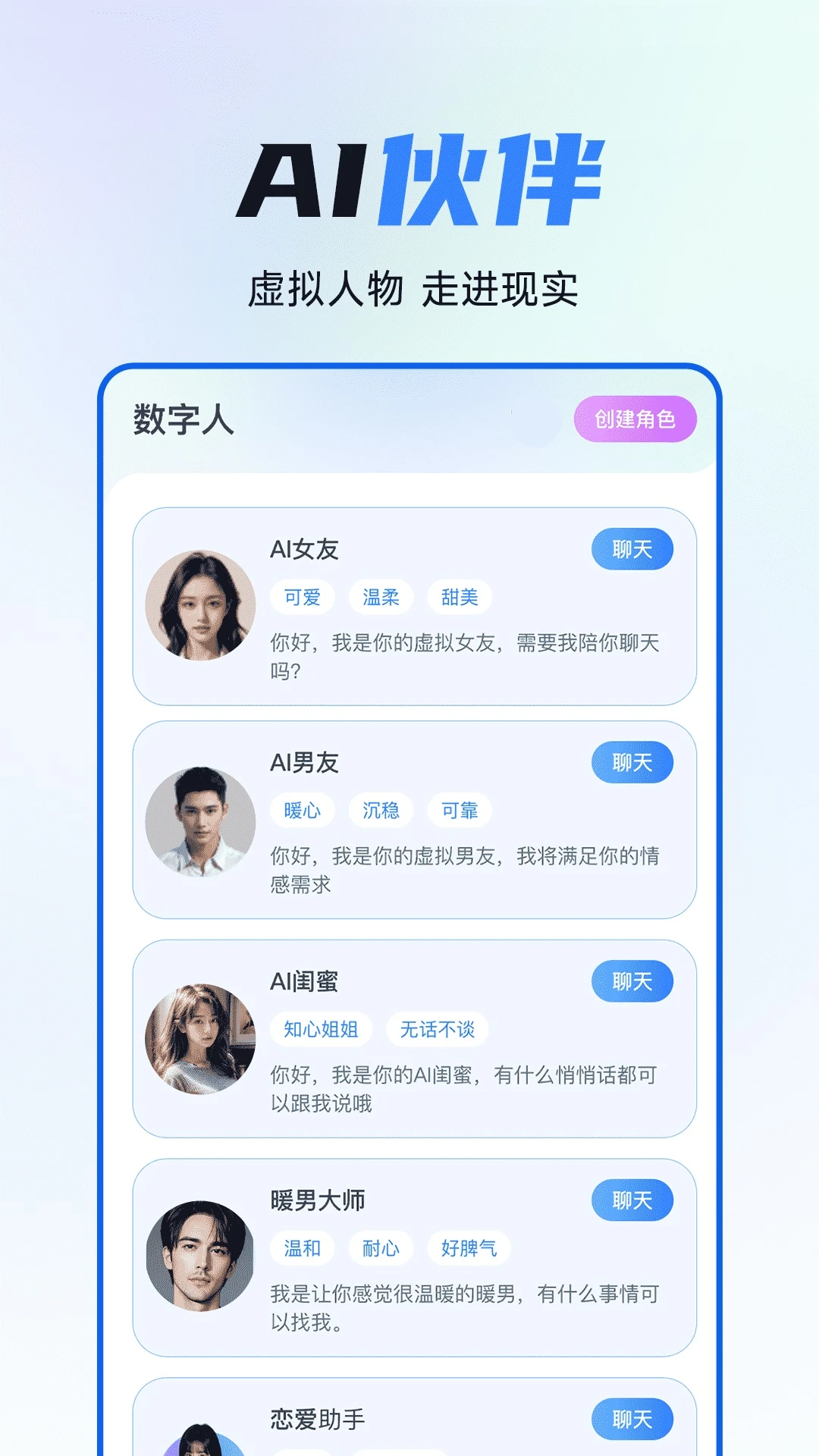 在数字人界面,选择自己感兴趣的角色进行对话即可