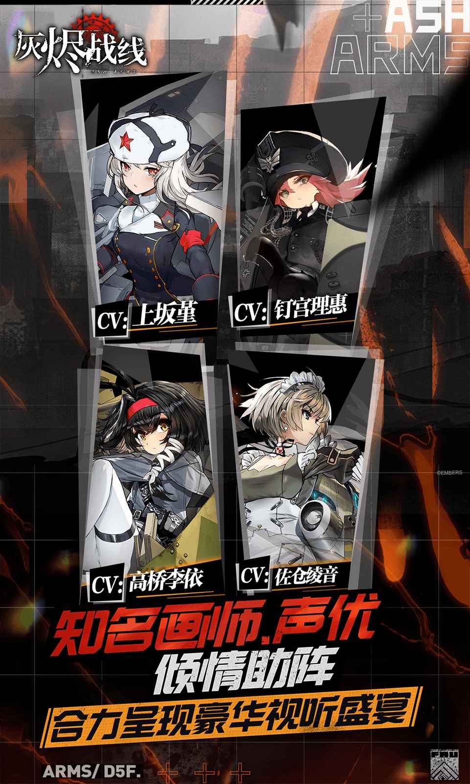 《灰烬战线》力邀上坂堇、高桥李依、佐仓绫音、钉宫理惠等多位日本超一线人气声优,为性格各异的军武萌娘献声。“DOLLS”立绘均由知名画师担当设计,所装备的兵器也全部经过严格考据,在细节方面尽数还原历史同名军武!