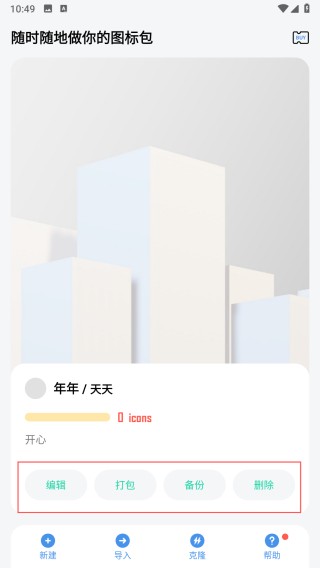 3、创建完成后用户可以对图标包进行编辑、打包、备份和删除;