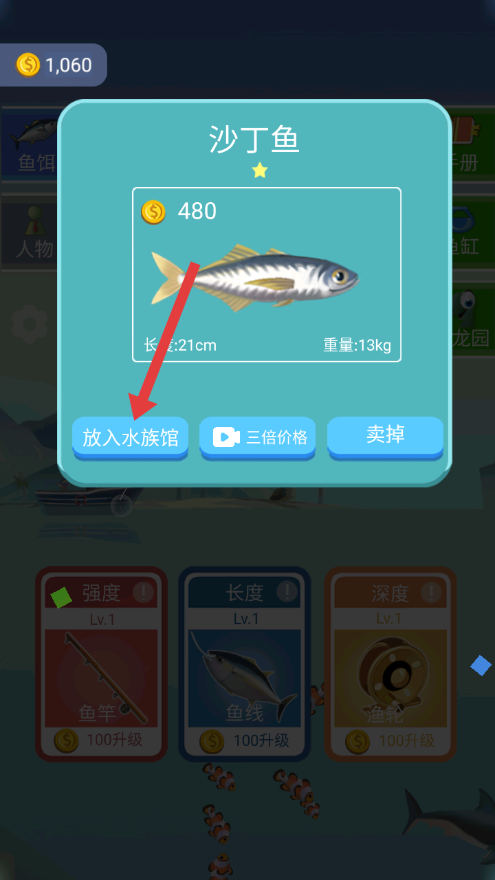 3、钓到鱼后,会显示鱼的信息,可选择放入水族馆展示,也能卖掉获取金币,还能看视频以三倍价格出售。