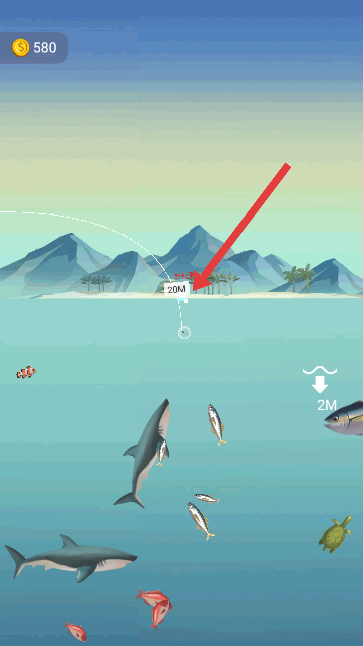 2、钓鱼时,鱼线会抛入水中,能看到不同种类的鱼水中游动,等待鱼上钩。