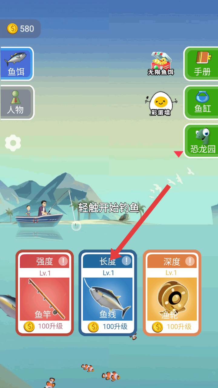 1、进入游戏界面,可看到鱼饵、人物等功能选项,还有鱼竿、鱼线、渔轮可升级,轻触就能开始钓鱼。