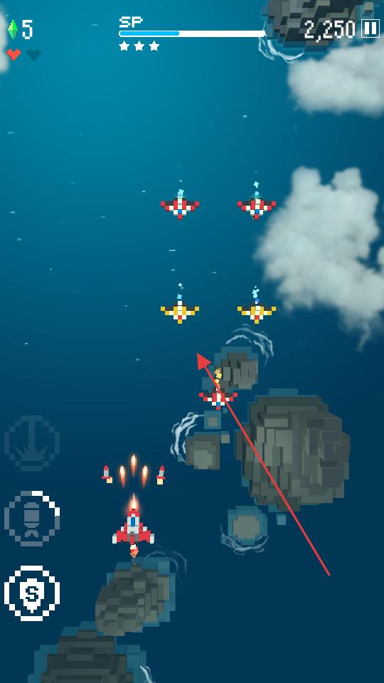 2、点击下方箭头指示的道具按钮,可以让火力更加强大,消灭更多的敌机。