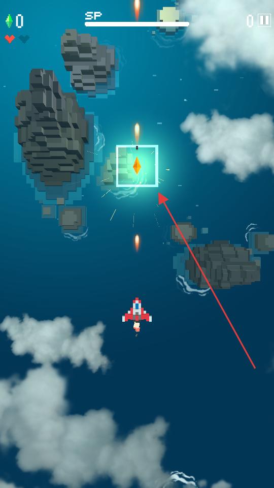 1、打开游戏操控飞机在天空中飞行,看到发光的菱形道具,调整飞机位置,靠近并收集该道具,为后续战斗获取助力。
