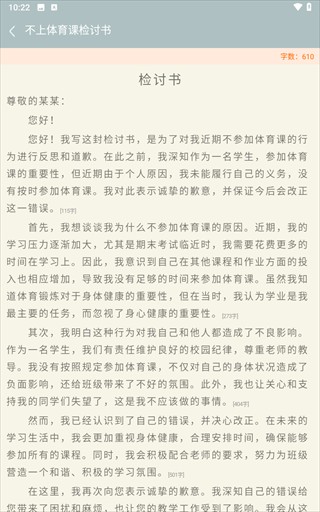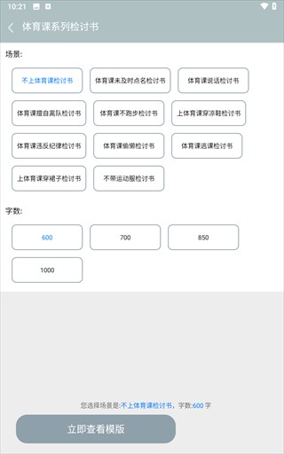 2、通过选择场景以及检讨字数来自动生成一个完整的检讨模板,直接复制用户就能够进行使用。