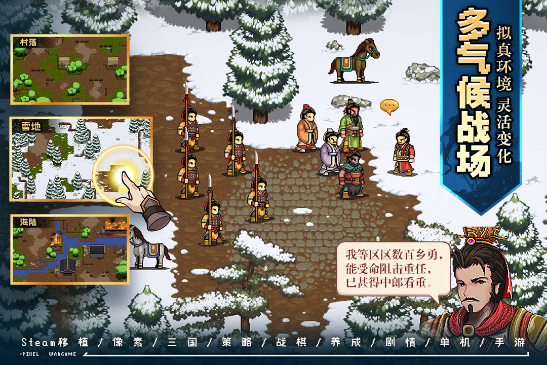 排兵布阵,指尖博弈。操作刘关张、诸葛亮、赵子龙等名将,挑战具有策略性的战场关卡。制定战略时需考虑地形、兵种克制、武将搭配和天气等因素,一举一动都可能改变战局导致攻守之势互换,谋而后动策略为王!