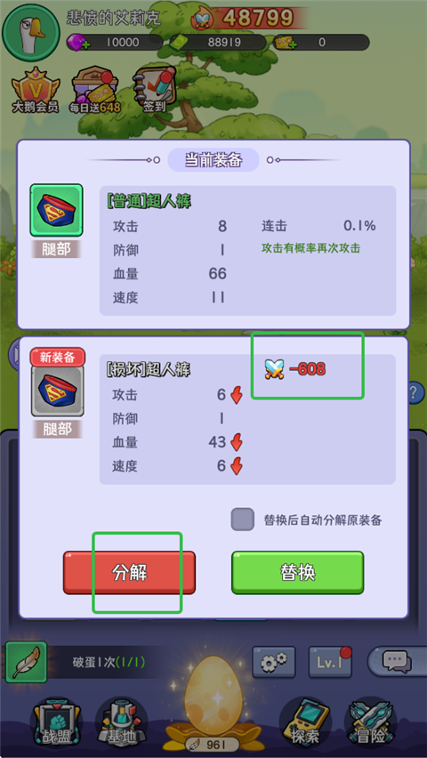 3、如果获得更好的装备还可以替换,旧装备可以分解获得资源;