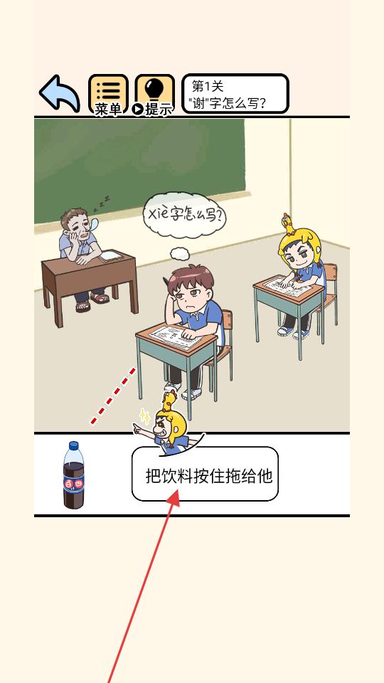 3、按照提示我们把下方这瓶可乐拿给这位同学喝,就能顺利通过第一关卡。