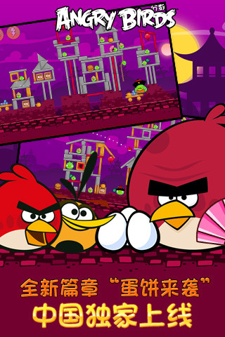 愤怒的小鸟(Angry Birds)这款游戏的故事相当有趣,为了报复偷走鸟蛋的肥猪们,鸟儿以自己的身体为武器,仿佛炮弹一样去攻击肥猪们的堡垒。游戏是十分卡通的2D画面,看着愤怒的红色小鸟,奋不顾身的往绿色的肥猪的堡垒砸去,那种奇妙的感觉还真是令人感到很欢乐。而游戏的配乐同样充满了欢乐的感觉,轻松的节奏,欢快的风格。不过在进行游戏的时候却没有这样的音乐,有点可惜。但是将鸟儿们弹射出去时,鸟儿的叫声倒是给人很好笑的感觉。
