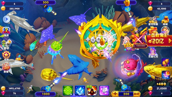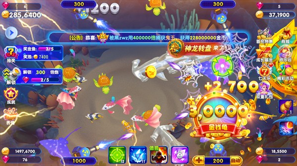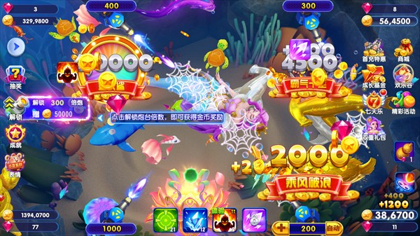 金蛋鱼、转盘鱼、皇冠鱼、聚宝盆、五灵印、糖果传奇、吞噬鱼、暴击鱼,丰富的鱼种,每种特殊鱼都是不同的玩法。