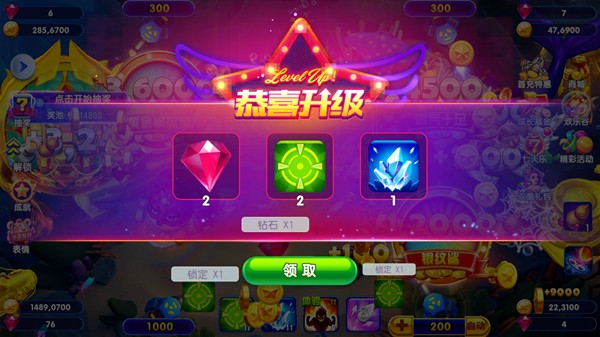 2、锁定炮位后,猎捕鱼时比较省力,但往往容易错过你想捕获的大鱼种类,当你的战绩不错时,则可以得到升级奖励,点领取即可。