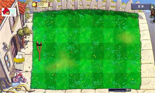 2、选择冒险模式开始闯关,利用场上的弹弓直接发送小鸟,这样就能成功消灭僵尸。