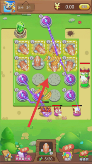2、游戏进行时,通过合理布局炮台等防御设施,使其攻击棋盘内的怪物(如紫色、绿色怪物)。
