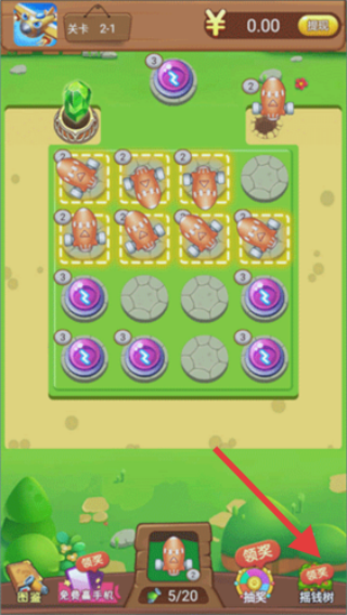3、完成关卡任务(如消灭一定数量怪物,满足“5/20”等进度要求)后,点击屏幕右下角的【领奖】按钮(如箭头所指)。