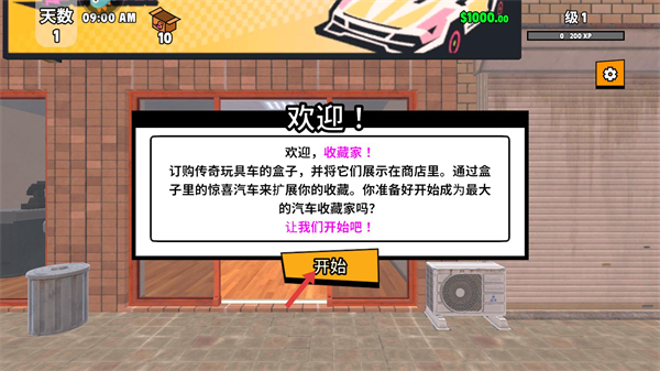 2、在欢迎界面点击开始,进入商店经营流程,初始拥有1000资金与10个盒子,需通过订购、展示玩具车积累资源与经验。