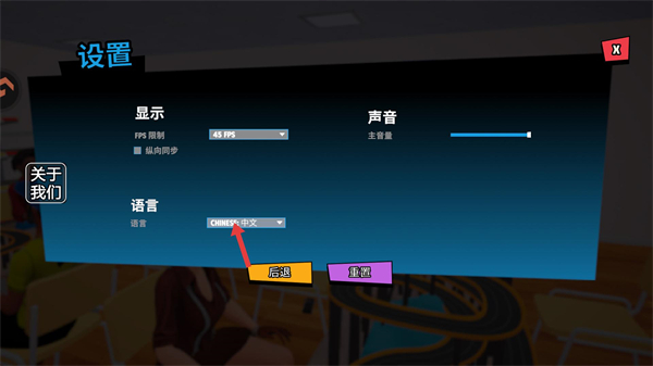 4、进入设置界面可调整显示如FPS限制、声音与语言,选择CHINESE中文可切换为中文界面,提升操作便利性后点击后退返回游戏。